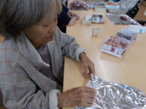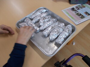 キレイな紅色のお芋🍠を1本ずつ濡れた新聞紙とアルミホイルに巻いていきます(^^♪